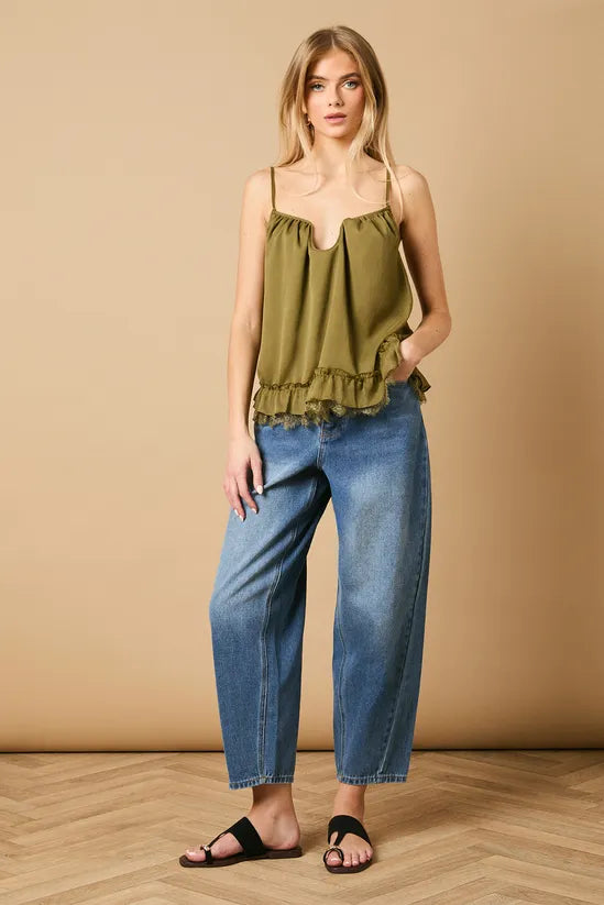 - Feminine babydoll silhouette with delicate adjustable spaghetti straps