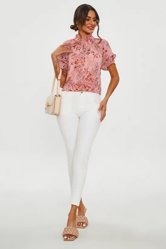 Introducing our Floral Print Frill Hem Sleeve High Neck Blouse Top in Pink, a delightful addition to your wardrobe. This charming blouse features a high neckline and elegant frill hem sleeves that exude femininity and grace. The vibrant floral print adds a pop of color to your ensemble, while the pink hue brings a touch of sweetness to your look. Whether you're dressing up for a brunch date or a day out with friends, this blouse effortlessly combines style and comfort. Pair it with your favorite jeans or a skirt for a chic and polished outfit. Elevate your wardrobe with this lovely blouse and make a statement wherever you go.