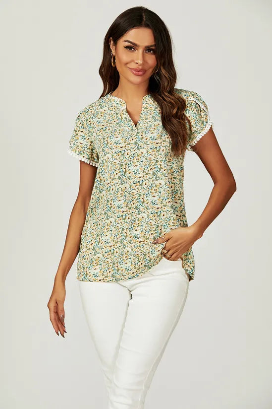 Floral Print Lace Trim Short Sleeve Blouse Top In Green Yellow
